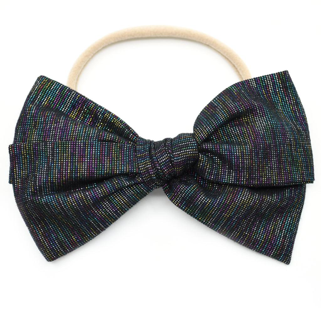 This Rona Bow features a beautiful, black linen/cotton blend fabric with a rainbow metallic thread woven throughout. It sparkles like glitter, but doesn't shed! It is a hand-tied, schoolgirl bow with sewn ends and is anchored so that the bow will not come untied. Colors may appear slightly different due to differences in resolution on your computer screen. Each bow can be placed on a reversible alligator clip or a Nylon headband. The alligator clip is reversible, to allow the bow to be worn on either side of the head. The nylon headbands are one size fits all and can be worn by newborns to adults--perfect for your growing child!