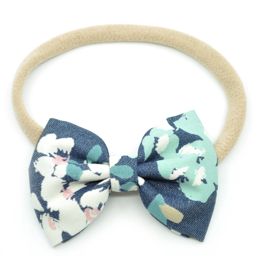 This Belle Bow/Bow Tie features a beautiful, 100% cotton, denim blue fabric, with a mint, ivory, and pink floral print. Colors may appear slightly different due to differences in resolution on your computer screen. Each bow can be placed on an alligator clip or a Nylon headband. This style is also perfect to be worn as a bow tie for a newborn or toddler! The nylon headbands are one size fits all and can be worn by newborns to adults--perfect for your growing child!