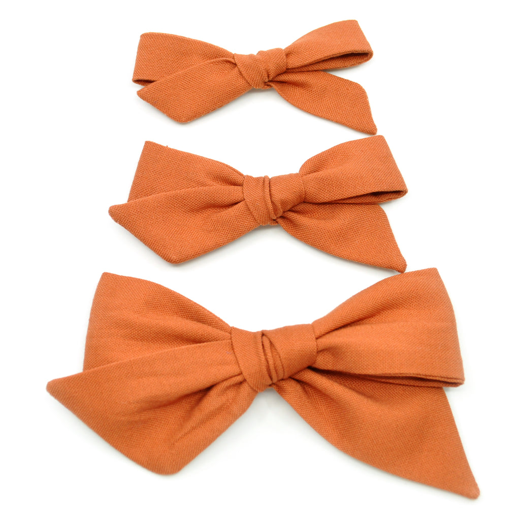 This Evy Bow features a beautiful, 100% cotton, burnt orange colored fabric. It is a hand-tied, schoolgirl bow with sewn ends and is anchored so that the bow will not come untied. Colors may appear slightly different due to differences in resolution on your computer screen. Each bow can be placed on a reversible alligator clip or a Nylon headband. The alligator clip is reversible, to allow the bow to be worn on either side of the head. The nylon headbands are one size fits all and can be worn by newborns to adults--perfect for your growing child!