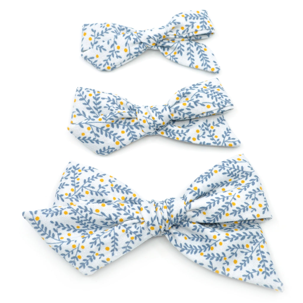 This Evy Bow features a beautiful, 100% cotton, dusty gray fabric with a steel blue vine print. It is a hand-tied, schoolgirl bow with sewn ends and is anchored so that the bow will not come untied. Colors may appear slightly different due to differences in resolution on your computer screen. Each bow can be placed on a reversible alligator clip or a Nylon headband. The alligator clip is reversible, to allow the bow to be worn on either side of the head. The nylon headbands are one size fits all and can be worn by newborns to adults--perfect for your growing child!