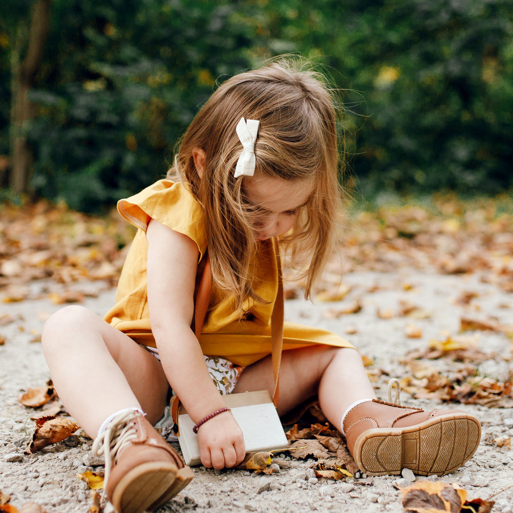 This Evy Bow features a beautiful, 100% cotton, gingerbread colored fabric. It is a hand-tied, schoolgirl bow with sewn ends and is anchored so that the bow will not come untied. Colors may appear slightly different due to differences in resolution on your computer screen. Each bow can be placed on a reversible alligator clip or a Nylon headband. The alligator clip is reversible, to allow the bow to be worn on either side of the head. The nylon headbands are one size fits all and can be worn by newborns to adults--perfect for your growing child!