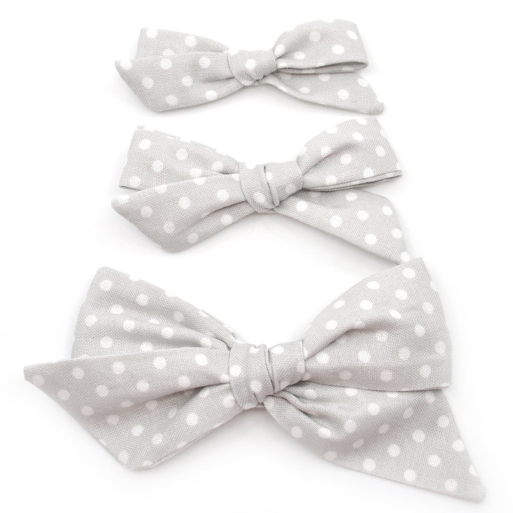 This Evy Bow features a beautiful, 100% cotton, grey fabric with a white polka dot print. It is a hand-tied, schoolgirl bow with sewn ends and is anchored so that the bow will not come untied. Colors may appear slightly different due to differences in resolution on your computer screen. Each bow can be placed on a reversible alligator clip or a Nylon headband. The alligator clip is reversible, to allow the bow to be worn on either side of the head. The nylon headbands are one size fits all and can be worn by newborns to adults--perfect for your growing child!