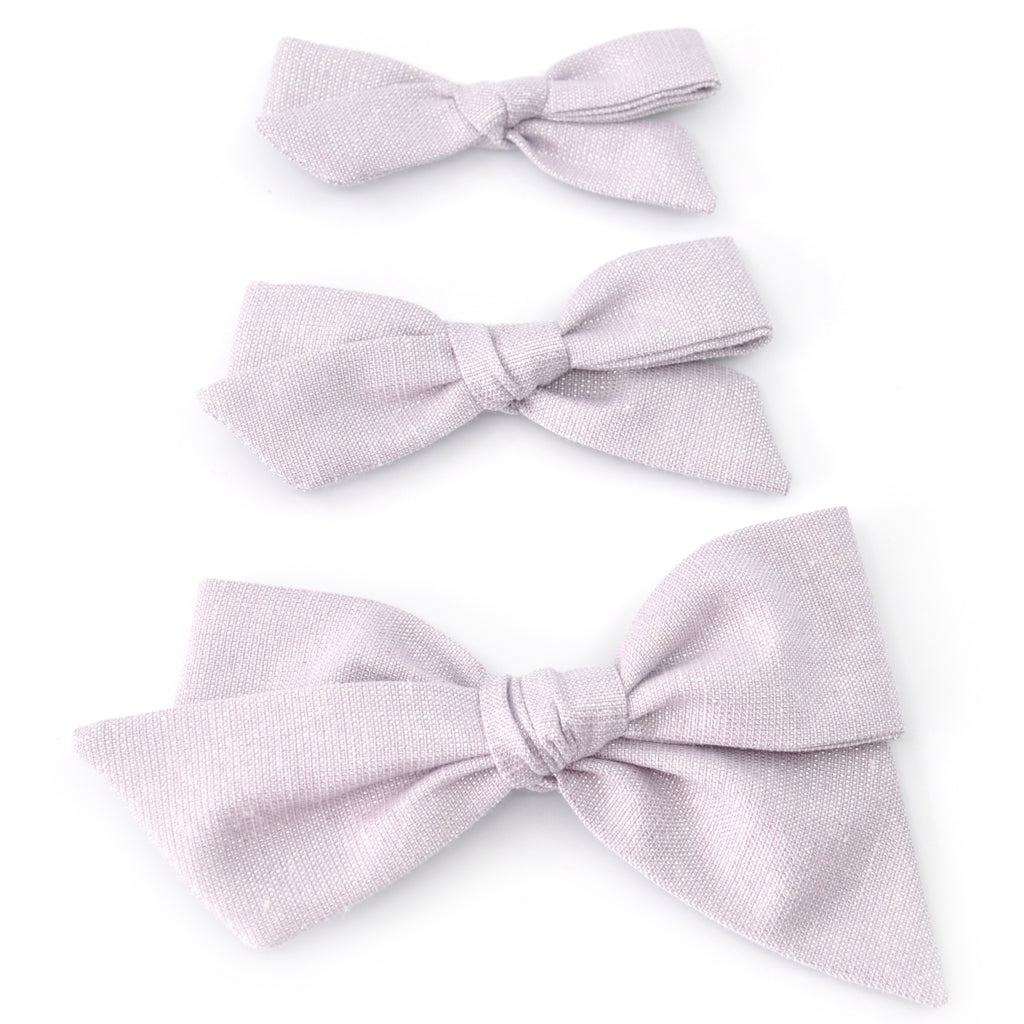 This Evy Bow features a beautiful, cotton/linen blend, lilac purple fabric with an iridescent metallic thread woven throughout. While the bow is very shimmery, it will NOT shed! It is a hand-tied, schoolgirl bow with sewn ends and is anchored so that the bow will not come untied. Colors may appear slightly different due to differences in resolution on your computer screen. Each bow can be placed on a reversible alligator clip or a Nylon headband. The alligator clip is reversible, to allow the bow to be worn on either side of the head. The nylon headbands are one size fits all and can be worn by newborns to adults--perfect for your growing child!