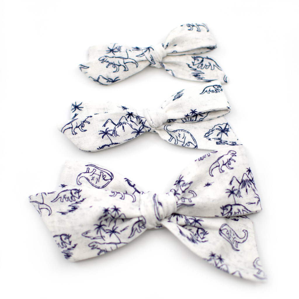 This Evy Bow features a beautiful, 100% cotton, white fabric with navy dinosaurs and volcanoes. It is a hand-tied, schoolgirl bow with sewn ends and is anchored so that the bow will not come untied. Colors may appear slightly different due to differences in resolution on your computer screen. Each bow can be placed on a reversible alligator clip or a Nylon headband. The alligator clip is reversible, to allow the bow to be worn on either side of the head. The nylon headbands are one size fits all and can be worn by newborns to adults--perfect for your growing child!