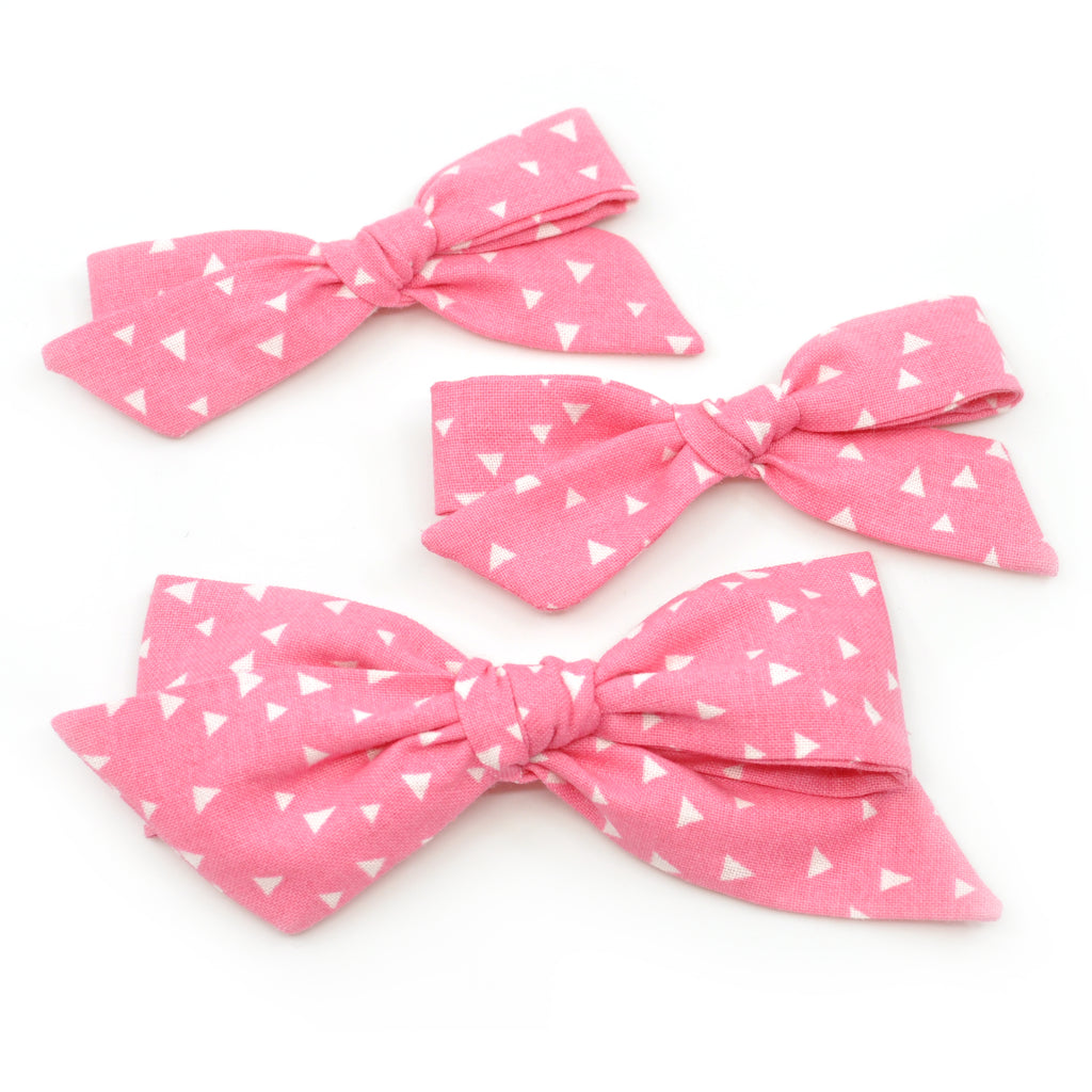 This Evy Bow features a beautiful, 100% cotton, pink fabric with a white triangle print. It is a hand-tied, schoolgirl bow with sewn ends and is anchored so that the bow will not come untied. Colors may appear slightly different due to differences in resolution on your computer screen. Each bow can be placed on a reversible alligator clip or a Nylon headband. The alligator clip is reversible, to allow the bow to be worn on either side of the head. The nylon headbands are one size fits all and can be worn by newborns to adults--perfect for your growing child!
