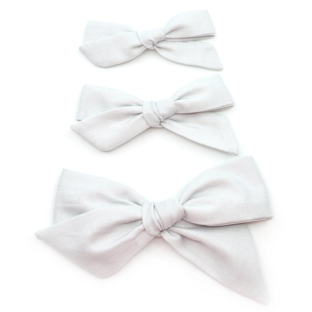 This Evy Bow features a beautiful, 100% cotton, silver fabric. It is a hand-tied, schoolgirl bow with sewn ends and is anchored so that the bow will not come untied. Colors may appear slightly different due to differences in resolution on your computer screen. Each bow can be placed on a reversible alligator clip or a Nylon headband. The alligator clip is reversible, to allow the bow to be worn on either side of the head. The nylon headbands are one size fits all and can be worn by newborns to adults--perfect for your growing child!