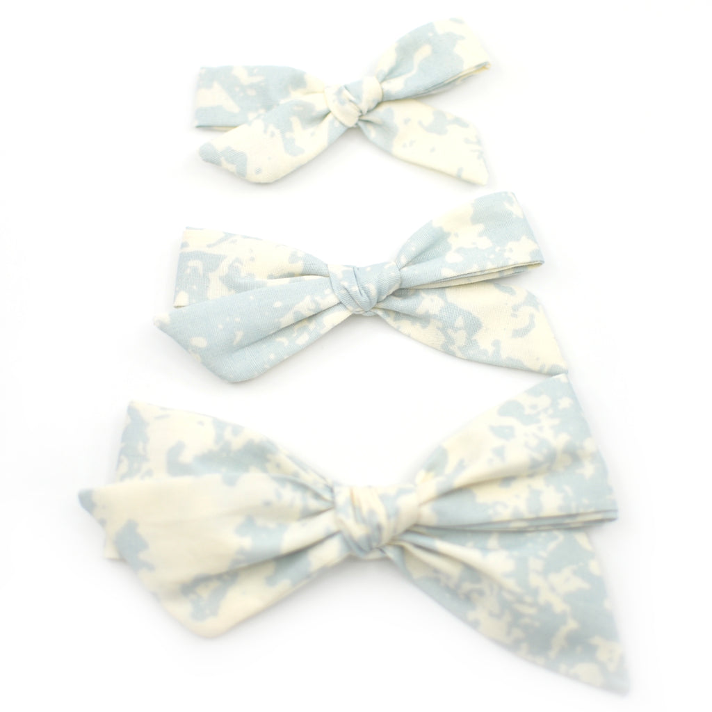 This Evy Bow features a beautiful, 100% cotton, ivory and blue stonewashed fabric. It is a hand-tied, schoolgirl bow with sewn ends and is anchored so that the bow will not come untied. Colors may appear slightly different due to differences in resolution on your computer screen. Each bow can be placed on a reversible alligator clip or a Nylon headband. The alligator clip is reversible, to allow the bow to be worn on either side of the head. The nylon headbands are one size fits all and can be worn by newborns to adults--perfect for your growing child!