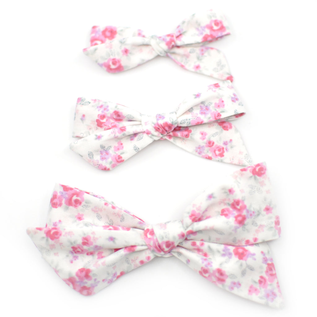 This Evy Bow features a beautiful, 100% cotton, white fabric with a tiny pink floral print. It is a hand-tied, schoolgirl bow with sewn ends and is anchored so that the bow will not come untied. Colors may appear slightly different due to differences in resolution on your computer screen. Each bow can be placed on a reversible alligator clip or a Nylon headband. The alligator clip is reversible, to allow the bow to be worn on either side of the head. The nylon headbands are one size fits all and can be worn by newborns to adults--perfect for your growing child!