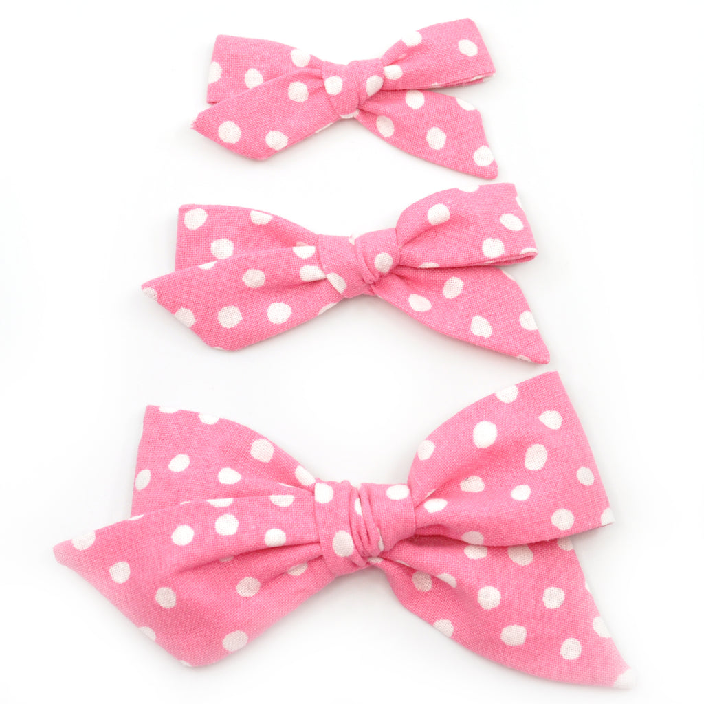 This Evy Bow features a beautiful, 100% cotton, pink fabric with a white polka dot print. It is a hand-tied, schoolgirl bow with sewn ends and is anchored so that the bow will not come untied. Colors may appear slightly different due to differences in resolution on your computer screen. Each bow can be placed on a reversible alligator clip or a Nylon headband. The alligator clip is reversible, to allow the bow to be worn on either side of the head. The nylon headbands are one size fits all and can be worn by newborns to adults--perfect for your growing child!