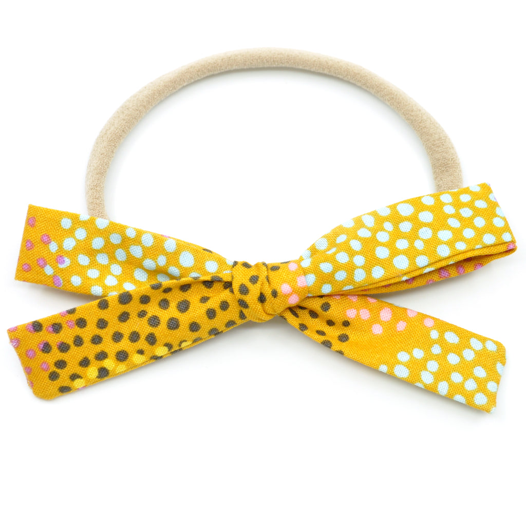 This Leni Bow features a beautiful, 100% cotton, mustard fabric with a multicolor polka dot print. It is a hand-tied, schoolgirl bow with sewn ends and is anchored so that the bow will not come untied. Colors may appear slightly different due to differences in resolution on your computer screen. Each bow can be placed on a reversible alligator clip or a Nylon headband. The alligator clip is reversible, to allow the bow to be worn on either side of the head. The nylon headbands are one size fits all and can be worn by newborns to adults--perfect for your growing child!