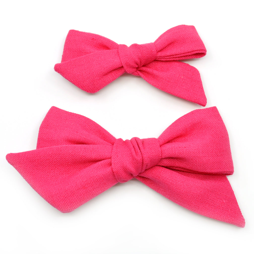 This Evy Bow features a beautiful, linen/cotton blend, magenta pink fabric. It is a hand-tied, schoolgirl bow with sewn ends and is anchored so that the bow will not come untied. Colors may appear slightly different due to differences in resolution on your computer screen. Each bow can be placed on a reversible alligator clip or a Nylon headband. The alligator clip is reversible, to allow the bow to be worn on either side of the head. The nylon headbands are one size fits all and can be worn by newborns to adults--perfect for your growing child!