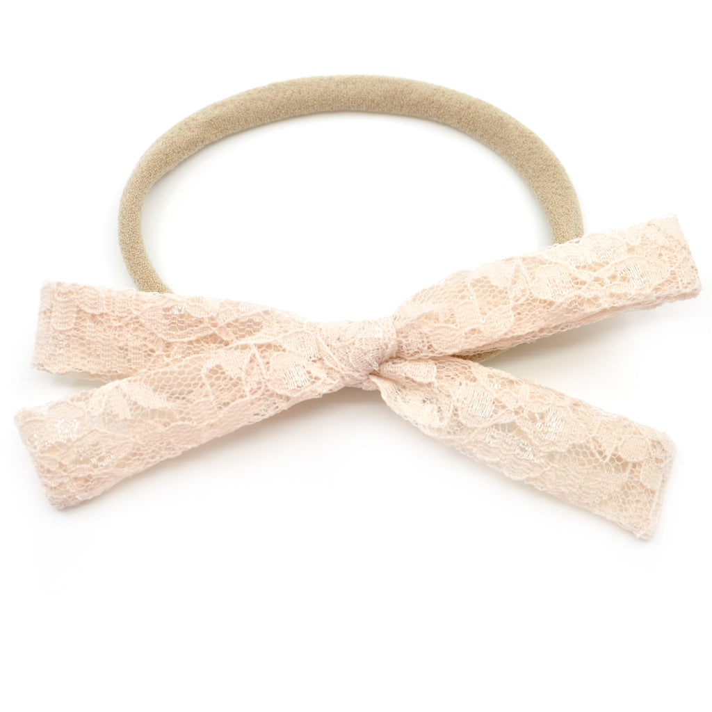 This Leni Bow features a beautiful, champagne lace. It is a hand-tied, schoolgirl bow with sewn ends and is anchored so that the bow will not come untied. Colors may appear slightly different due to differences in resolution on your computer screen. Each bow can be placed on a reversible alligator clip or a Nylon headband. The alligator clip is reversible, to allow the bow to be worn on either side of the head. The nylon headbands are one size fits all and can be worn by newborns to adults--perfect for your growing child!