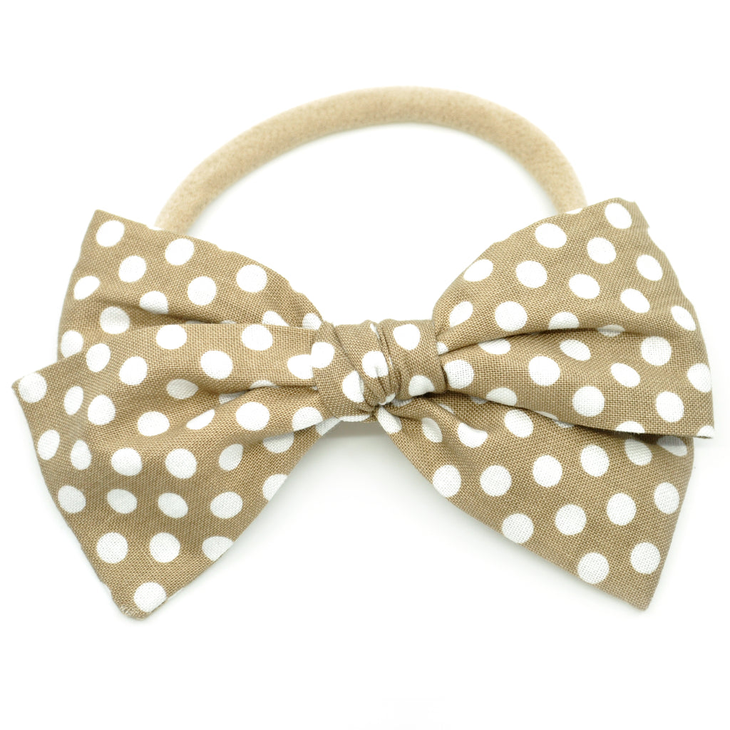 This Rona Bow features a beautiful, 100% cotton, gold colored fabric with a white polka dot print. It is a hand-tied, schoolgirl bow with sewn ends and is anchored so that the bow will not come untied. Colors may appear slightly different due to differences in resolution on your computer screen. Each bow can be placed on a reversible alligator clip or a Nylon headband. The alligator clip is reversible, to allow the bow to be worn on either side of the head. The nylon headbands are one size fits all and can be worn by newborns to adults--perfect for your growing child!