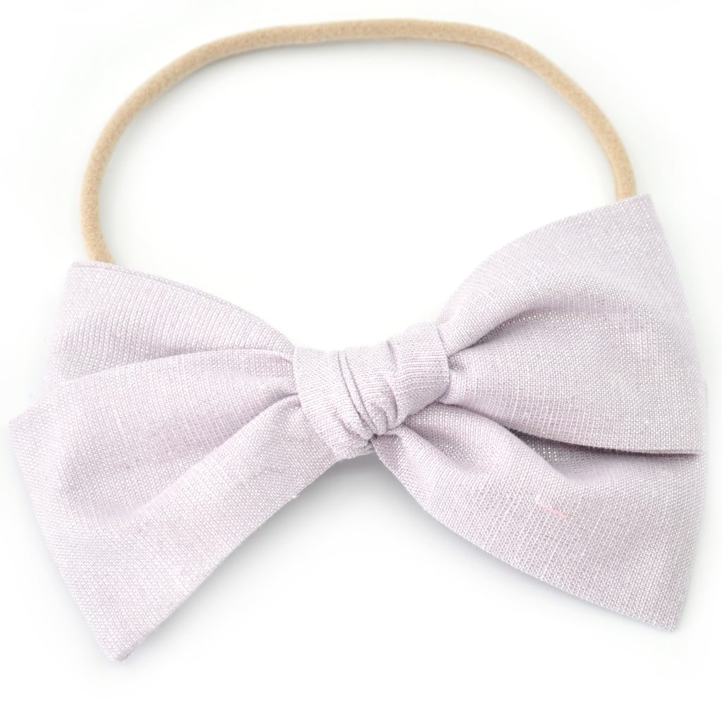 This Rona Bow features a beautiful, cotton/linen blend, lilac purple fabric with a silver metallic thread woven throughout. While the bow is very shimmery, it will NOT shed! It is a hand-tied, schoolgirl bow with sewn ends and is anchored so that the bow will not come untied. Colors may appear slightly different due to differences in resolution on your computer screen. Each bow can be placed on a reversible alligator clip or a Nylon headband. The alligator clip is reversible, to allow the bow to be worn on either side of the head. The nylon headbands are one size fits all and can be worn by newborns to adults--perfect for your growing child!