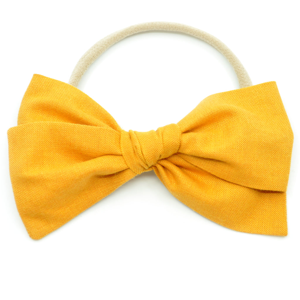 This Rona Bow features a beautiful, 100% cotton, mustard colored fabric. It is a hand-tied, schoolgirl bow with sewn ends and is anchored so that the bow will not come untied. Colors may appear slightly different due to differences in resolution on your computer screen. Each bow can be placed on a reversible alligator clip or a Nylon headband. The alligator clip is reversible, to allow the bow to be worn on either side of the head. The nylon headbands are one size fits all and can be worn by newborns to adults--perfect for your growing child!
