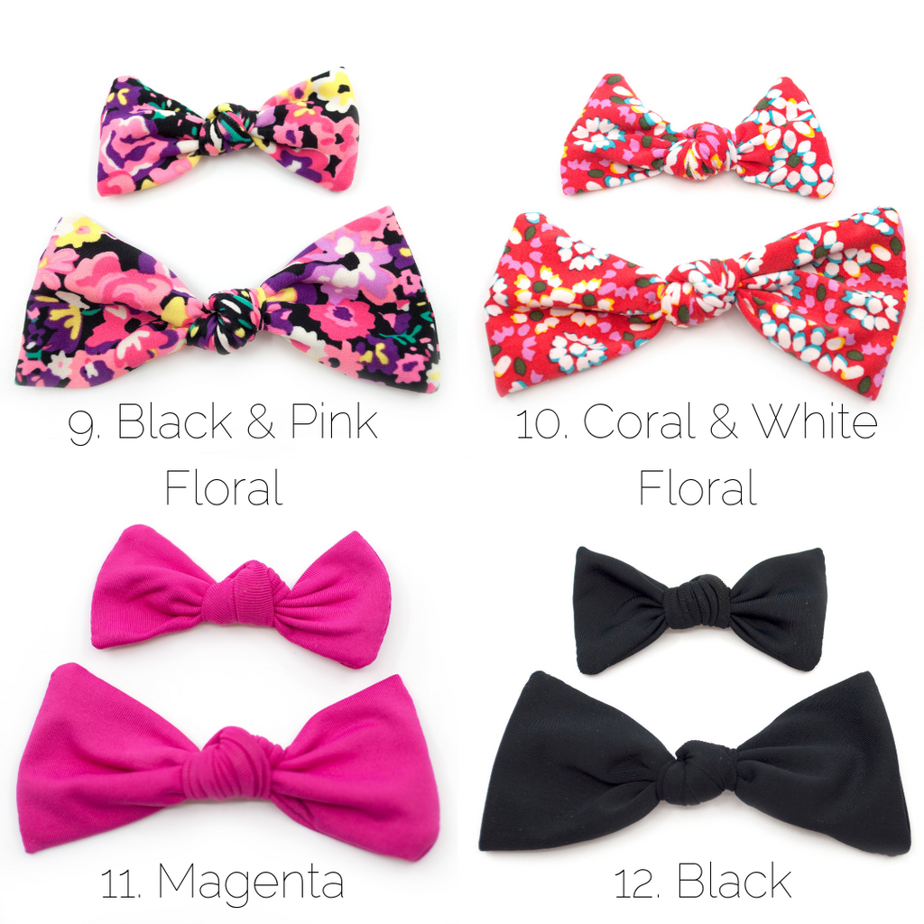 These Knot Bows feature stretchy swimsuit fabric in 12 color/pattern options. (Swipe to see the available colors) They are waterproof and made from up-cycled swimsuit tops! (Only the tops, no swimsuit bottoms were used). See below for care instructions. Colors may appear slightly different due to differences in resolution on your computer screen. Each bow can be placed on a reversible alligator clip, a Nylon headband, or medium hair tie (1.5" diameter). The alligator clip is reversible, to allow the bow to be worn on either side of the head. The nylon headbands are one size fits all and can be worn by newborns to adults--perfect for your growing child!