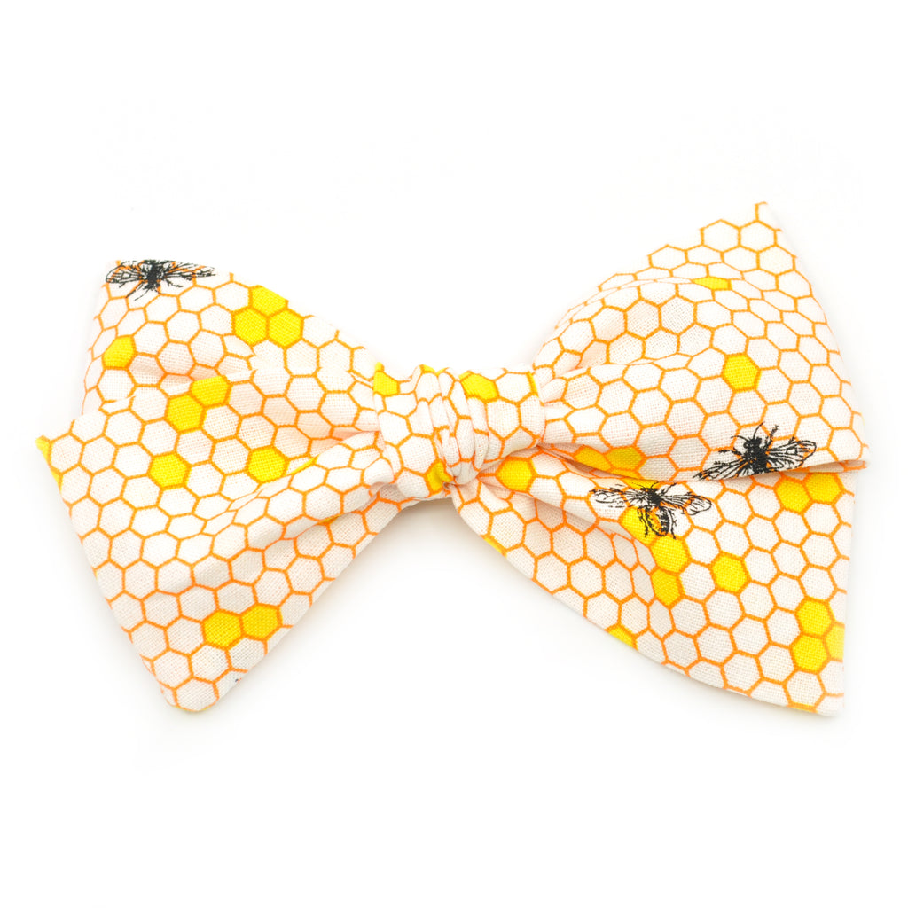 This Rona Bow features a beautiful, 100% cotton fabric with a honeybee-hive print. It is a hand-tied, schoolgirl bow with sewn ends and is anchored so that the bow will not come untied. Colors may appear slightly different due to differences in resolution on your computer screen. Each bow can be placed on a reversible alligator clip or a Nylon headband. The alligator clip is reversible, to allow the bow to be worn on either side of the head. The nylon headbands are one size fits all and can be worn by newborns to adults--perfect for your growing child!