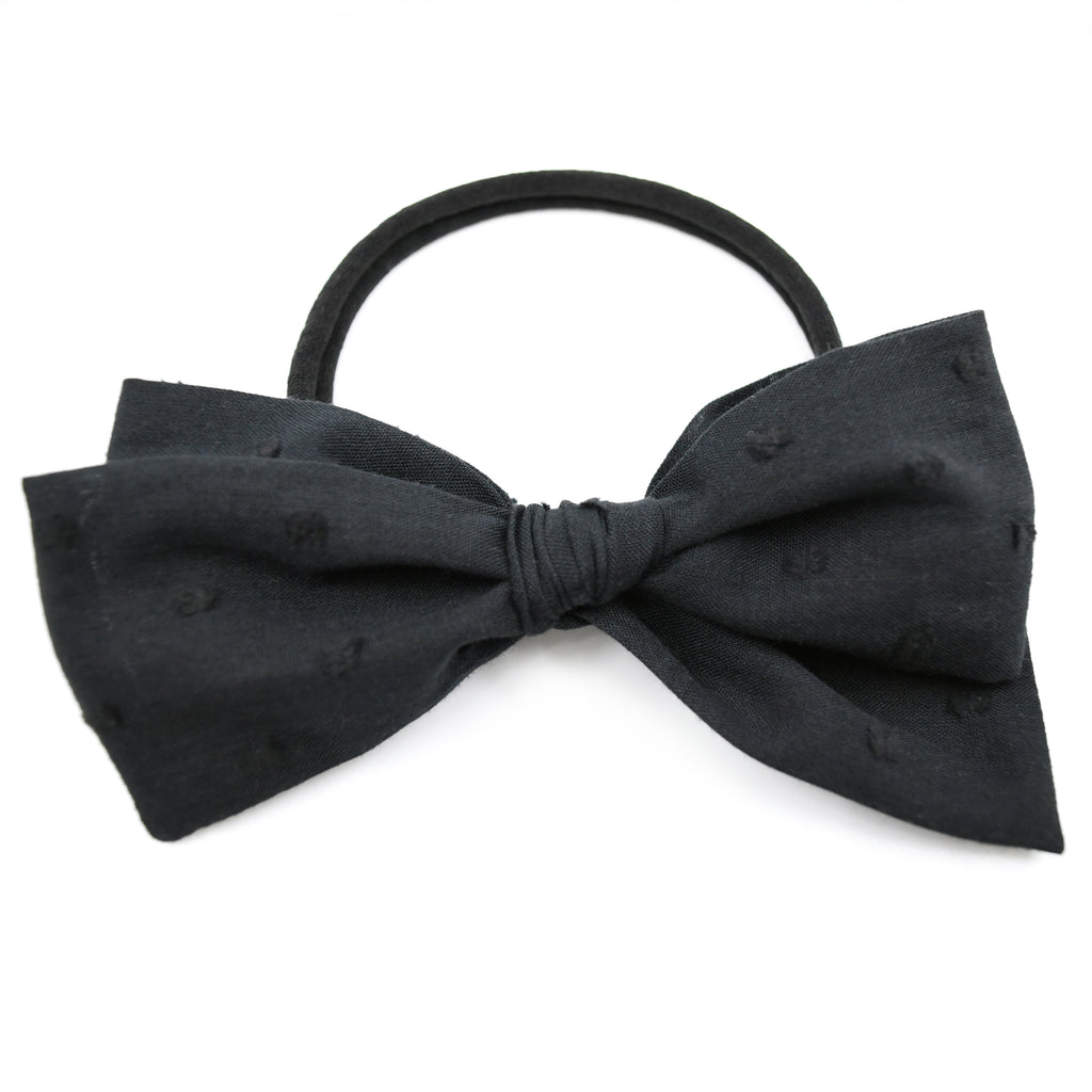 This Rona Bow features a beautiful, 100% cotton, black Swiss dot fabric. It is a hand-tied, schoolgirl bow with sewn ends and is anchored so that the bow will not come untied. Colors may appear slightly different due to differences in resolution on your computer screen. Each bow can be placed on a reversible alligator clip or a Nylon headband. The alligator clip is reversible, to allow the bow to be worn on either side of the head. The nylon headbands are one size fits all and can be worn by newborns to adults--perfect for your growing child!