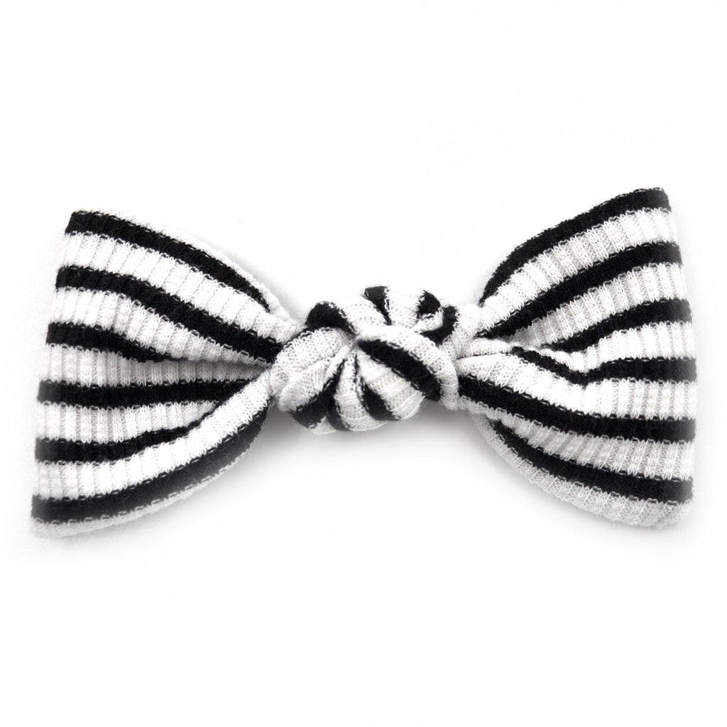 This knotted bow tie features a black and white striped knit fabric. Colors may appear slightly different due to differences in resolution on your computer/phone screen.