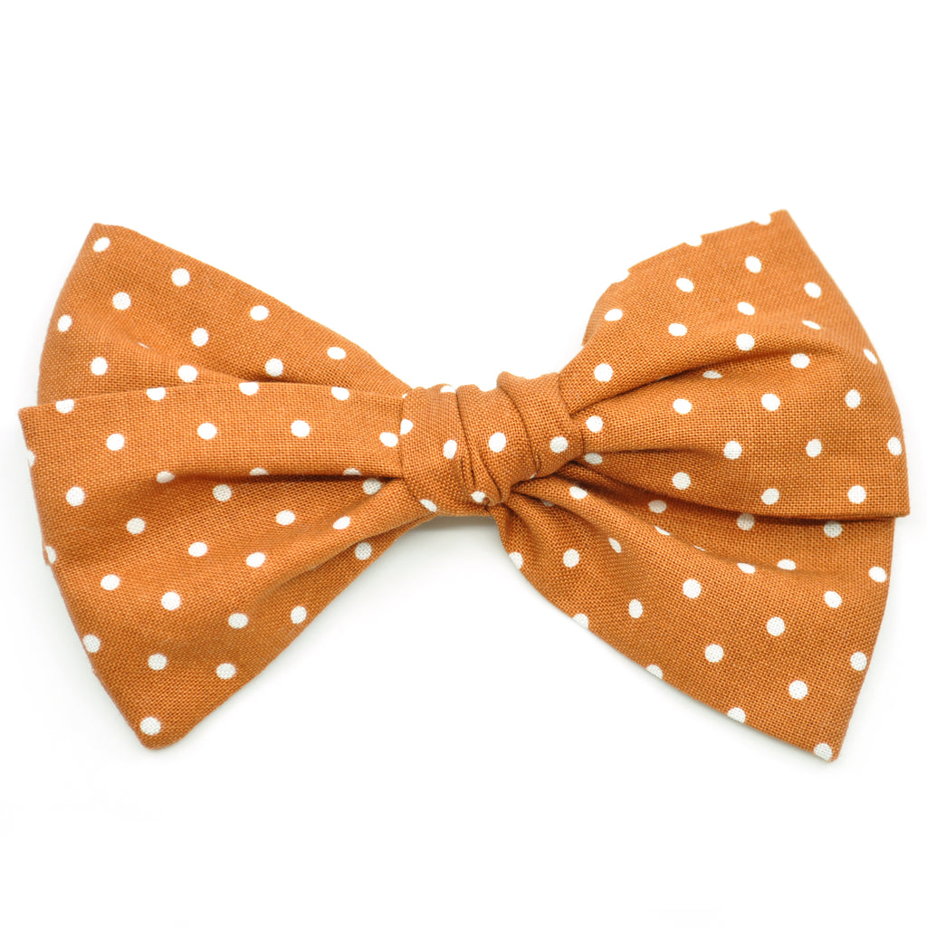 This Rona Bow features a beautiful, 100% cotton, cinnamon fabric with a white polka dot print. It is a hand-tied, schoolgirl bow with sewn ends and is anchored so that the bow will not come untied. Colors may appear slightly different due to differences in resolution on your computer screen. Each bow can be placed on a reversible alligator clip or a Nylon headband. The alligator clip is reversible, to allow the bow to be worn on either side of the head. The nylon headbands are one size fits all and can be worn by newborns to adults--perfect for your growing child!