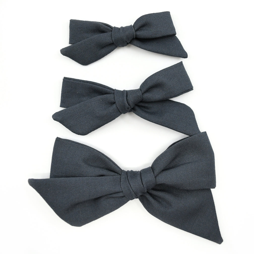 This Evy Bow features a beautiful, 100% cotton, Gotham Grey fabric. It is a hand-tied, schoolgirl bow with sewn ends and is anchored so that the bow will not come untied. Colors may appear slightly different due to differences in resolution on your computer screen. Each bow can be placed on a reversible alligator clip or a Nylon headband. The alligator clip is reversible, to allow the bow to be worn on either side of the head. The nylon headbands are one size fits all and can be worn by newborns to adults--perfect for your growing child!