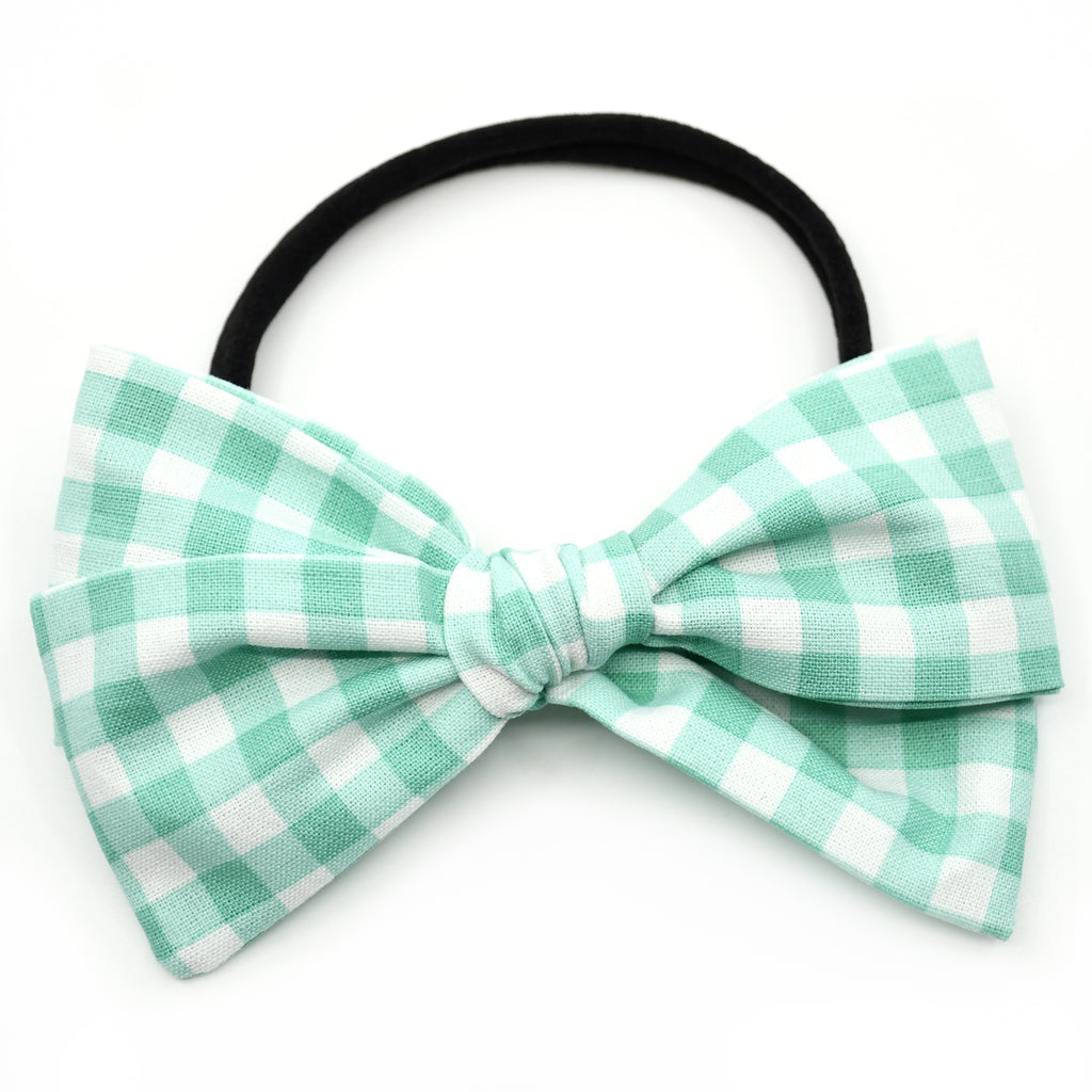 This Rona Bow features a beautiful, 100% cotton fabric with a mint gingham print. It is a hand-tied, schoolgirl bow with sewn ends and is anchored so that the bow will not come untied. Colors may appear slightly different due to differences in resolution on your computer screen. Each bow can be placed on a reversible alligator clip or a Nylon headband. The alligator clip is reversible, to allow the bow to be worn on either side of the head. The nylon headbands are one size fits all and can be worn by newborns to adults--perfect for your growing child!