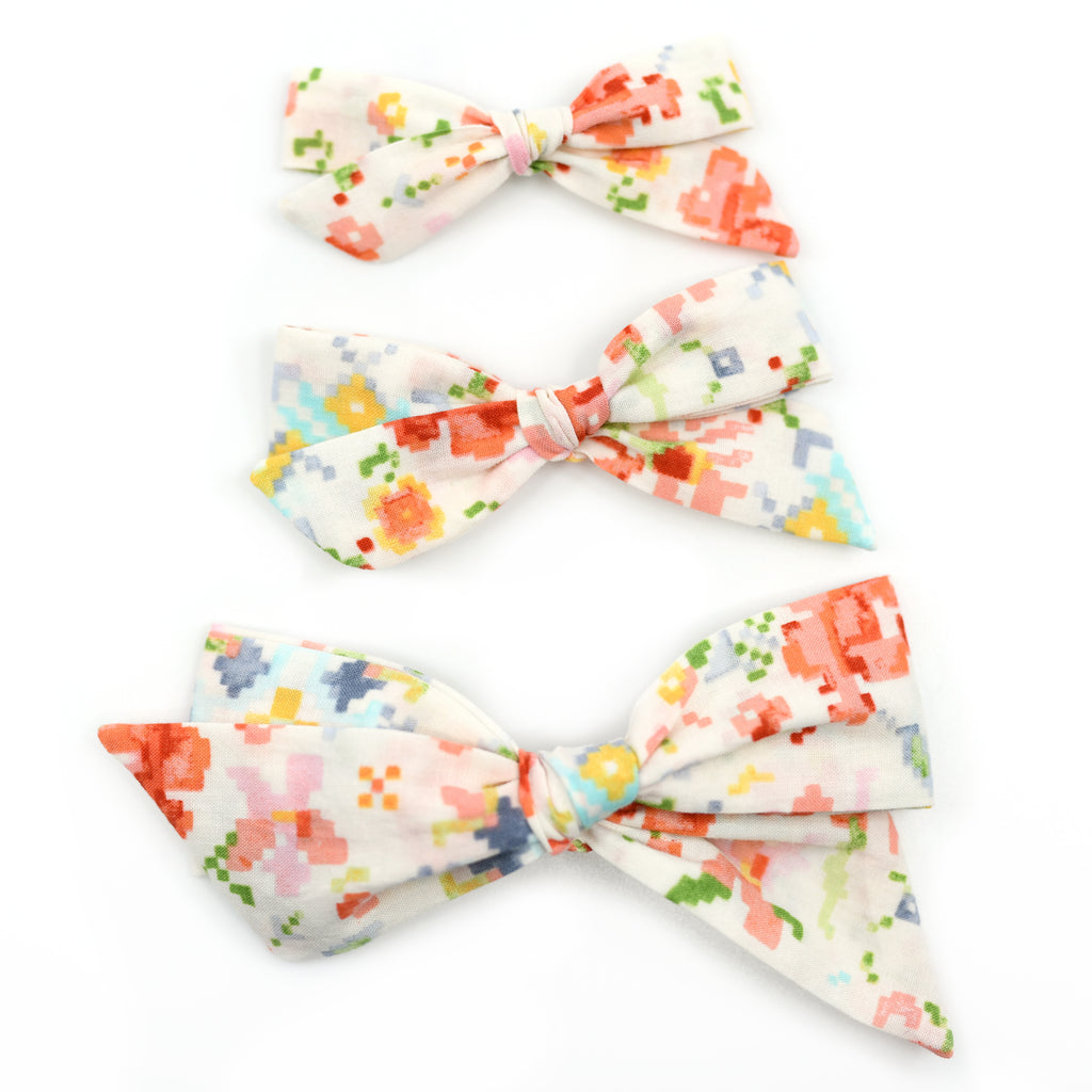 This Evy Bow features a beautiful, 100% cotton, off white fabric with a pixelated floral print. It is a hand-tied, schoolgirl bow with sewn ends and is anchored so that the bow will not come untied. Colors may appear slightly different due to differences in resolution on your computer screen. Each bow can be placed on a reversible alligator clip or a Nylon headband. The alligator clip is reversible, to allow the bow to be worn on either side of the head. The nylon headbands are one size fits all and can be worn by newborns to adults--perfect for your growing child!