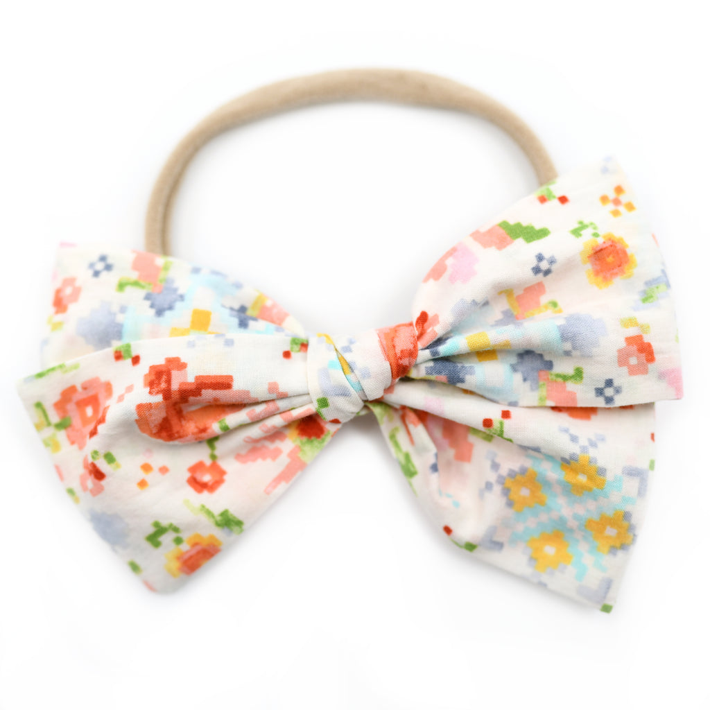 This Rona Bow features a beautiful, 100% cotton, off white fabric with a pixelated floral print. It is a hand-tied, schoolgirl bow with sewn ends and is anchored so that the bow will not come untied. Colors may appear slightly different due to differences in resolution on your computer screen. Each bow can be placed on a reversible alligator clip or a Nylon headband. The alligator clip is reversible, to allow the bow to be worn on either side of the head. The nylon headbands are one size fits all and can be worn by newborns to adults--perfect for your growing child!