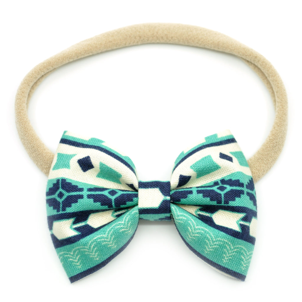 This Belle Bow/Bow Tie features a beautiful, 100% cotton, teal aztec print fabric. Colors may appear slightly different due to differences in resolution on your computer screen. Each bow can be placed on an alligator clip or a Nylon headband. This style is also perfect to be worn as a bow tie for a newborn or toddler! The nylon headbands are one size fits all and can be worn by newborns to adults--perfect for your growing child!