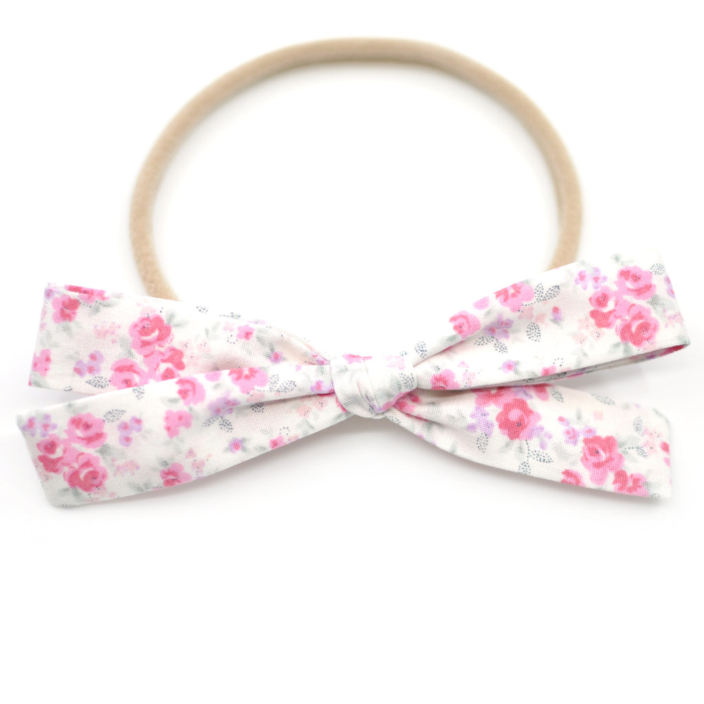 This Leni Bow features a beautiful, 100% cotton, white fabric with a tiny pink floral print. It is a hand-tied, schoolgirl bow with sewn ends and is anchored so that the bow will not come untied. Colors may appear slightly different due to differences in resolution on your computer screen. Each bow can be placed on a reversible alligator clip or a Nylon headband. The alligator clip is reversible, to allow the bow to be worn on either side of the head. The nylon headbands are one size fits all and can be worn by newborns to adults--perfect for your growing child!